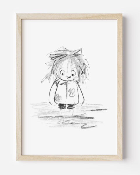 Personalised Colour Illustration of little one with small object (ie: toy, blanket, food item etc.), optional addition of date, name or short message and custom background colour.
