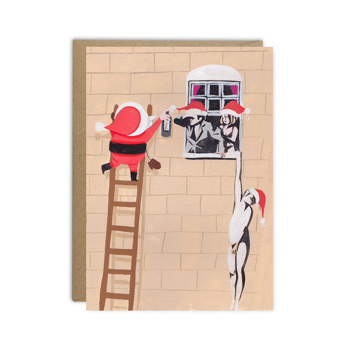 A card to celebrate the much photographed Banksy artwork on Park Street in Bristol. A playful twist where Santa sprays Christmas hats onto Banksy’s work. Greetings from Sarah celebrates the quirks of different locations across the UK and has created this Bristol themed Christmas card as part of the journey.